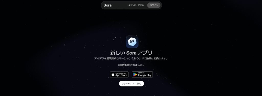 アクセス方法招待コード不要で順次提供される機能制限付きトライアル版。または利用不可ChatGPT Plus(月額20ドル)またはSora Pro(上位プラン)に加入することで利用可能。